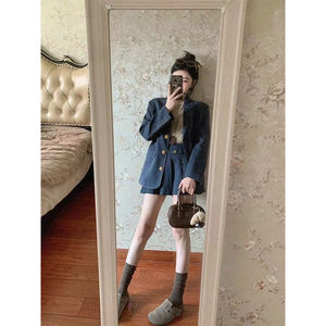 设计感小众廓形西装外套女春秋学院风西服百褶裙短款针织上衣套装