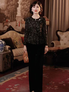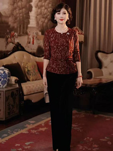 时尚洋气圆领印花捏褶显瘦妈妈装两件套气质小衫休闲宽松减龄套装
