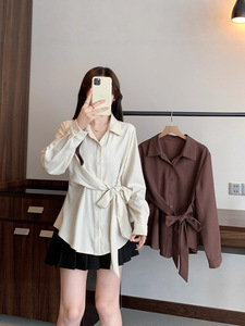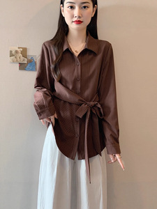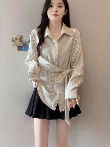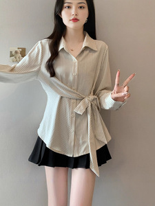 2025秋装新款胖mm大码女时尚设计感条纹绑带收腰显瘦衬衫上衣