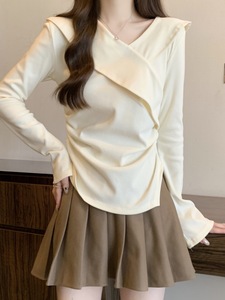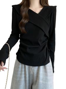 不规则v领长袖t恤女秋季新款大码胖mm打底衫遮肚子纯欲风短款上衣