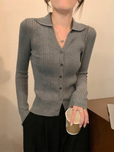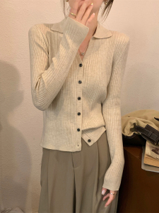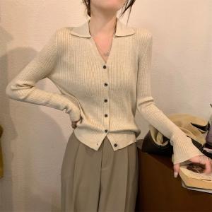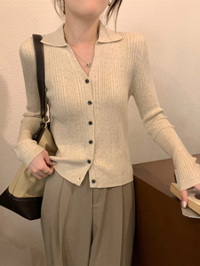 杏色螺纹针织开衫女春秋polo领上衣轻熟风纯欲V领翻领长袖打底衫