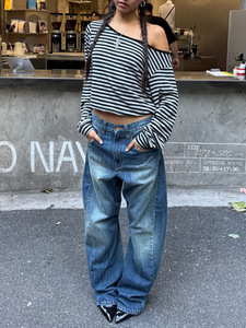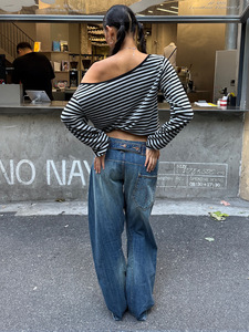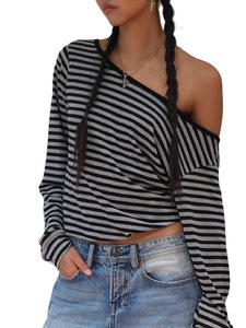 美式复古辣妹斜肩条纹露肩长袖T恤古早纯欲简约休闲亲肤显瘦上衣