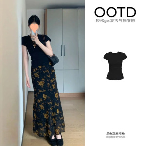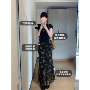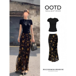 黑色高级感碎花裙2025半身裙子套装女夏季两件套轻熟修身包臀长裙