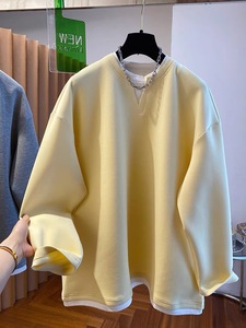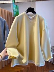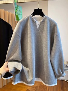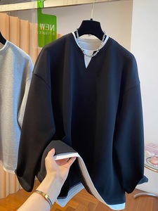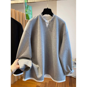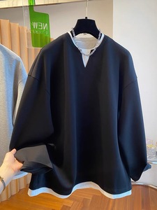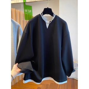 跨境240斤大码纯色设计感假两件V领卫衣女装春秋宽松套头撞色上衣