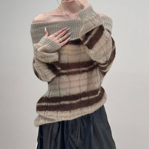 2025一字肩翻领毛衣条纹针织衫女秋季马海毛慵懒穿搭修身长袖上衣