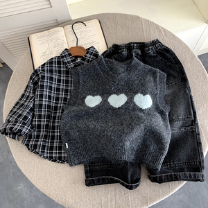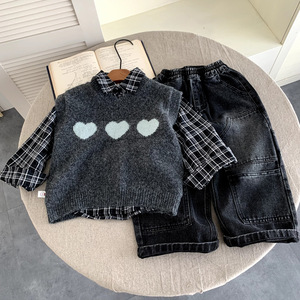 男童春秋套装2025新款中小儿童女宝宝秋季三件套马甲衬衫牛仔裤潮