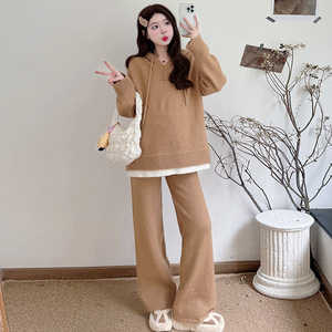 网红同款秋冬新品加厚针织连帽宽松毛衣阔腿裤百搭保暖孕妇套装女