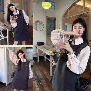 粉色长袖翻领内搭衬衫宽松立体蝴蝶结背心裙两件套新款甜辣温柔风