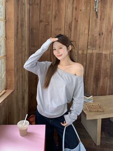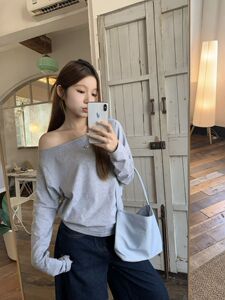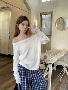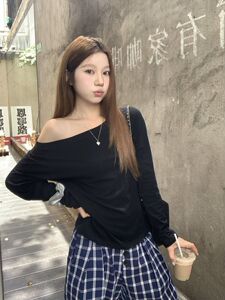 美式复古斜肩长袖t恤女早秋季上衣2025新款设计感小众宽松打底衫