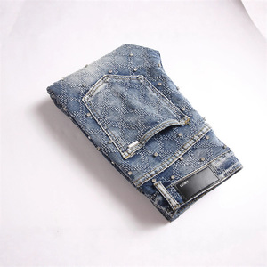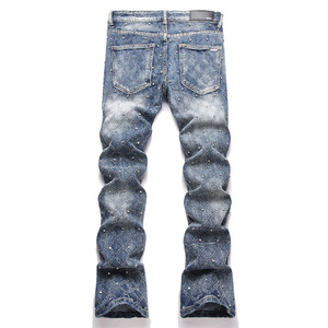 外贸风格朋克蓝色修身弹力柳丁刺绣青少年喇叭男式牛仔裤潮3986