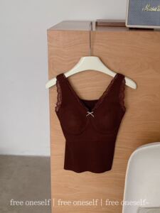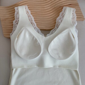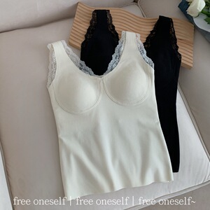 秋冬新款内搭V领羊绒蕾丝保暖背心带胸垫文胸女打底一体式内衣女