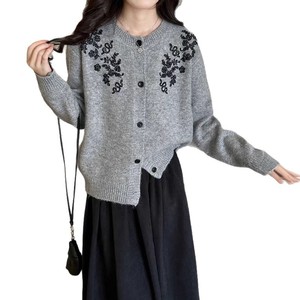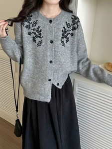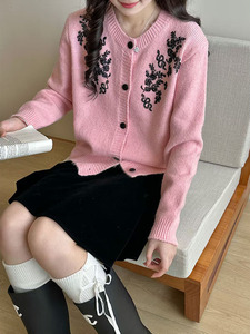 早秋新款重工钉钻少女风甜美浪漫短款刺绣针织小开衫女毛衣外套