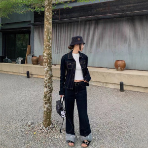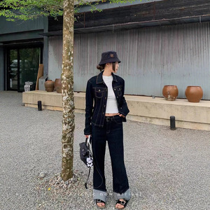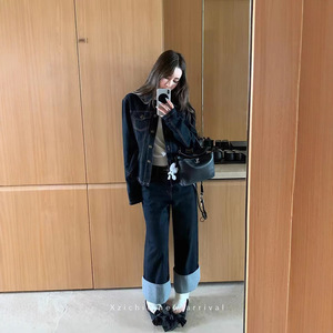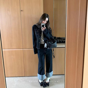 Xzichic 时髦尖子生美式休闲藏青原色牛仔夹克外套/牛仔裤套装女