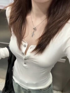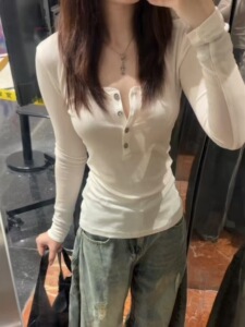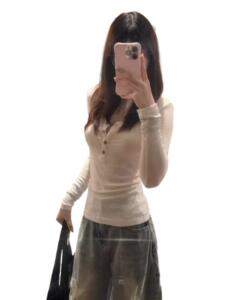 美式辣妹白色半开领长袖t恤女早秋季单穿薄款巨好看打底衫上衣潮