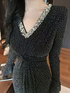 2025春夏新款V领钉钻收腰烫钻黑色弹力长裙连衣裙礼服法式优雅
