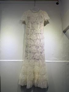 2025春夏新款圆领钉钻短袖复古蕾丝花朵收腰修身中长裙连衣裙腰带