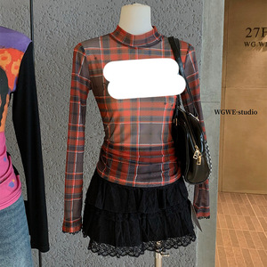 WGWE7082辣妹复古格纹印花长袖T恤秋季修身显瘦百搭上衣