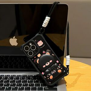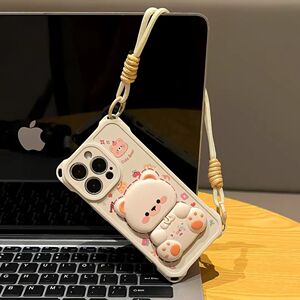 可爱小熊挂绳镜子适用苹果16promax1514手机壳四角防摔手机保护套