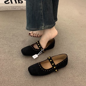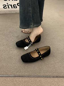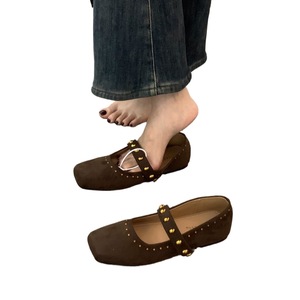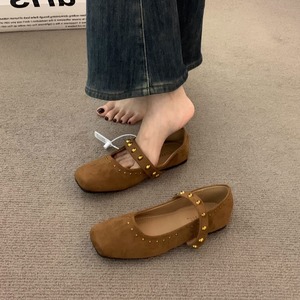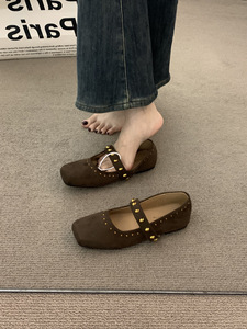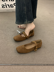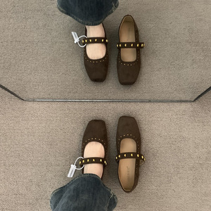 复古绒面摩卡棕玛丽珍单鞋女鞋子2025春秋季铆钉配裙子通勤勃肯鞋