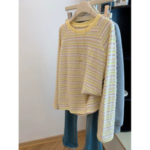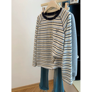 蓝色条纹撞色爱心刺绣插肩长袖t恤女早秋季圆领宽松韩系减龄上衣