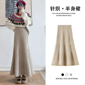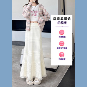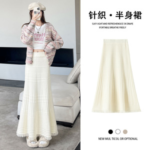 遮肉针织流苏半身裙女秋冬新款高腰褶皱大摆a字糯米裙长款伞裙子