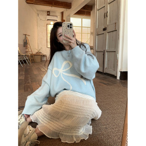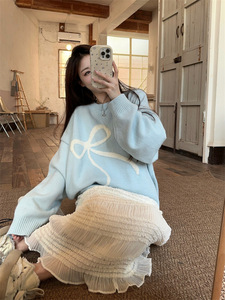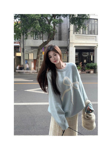 秋冬宽松慵懒风显瘦圆领毛衣时尚甜美温柔风蝴蝶结提花百搭上衣女