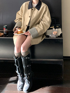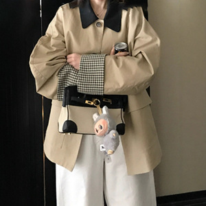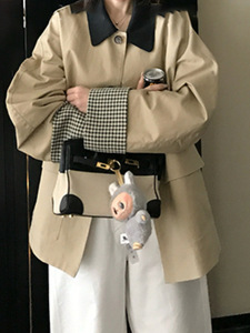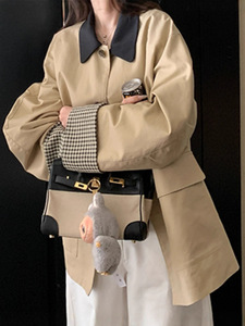 韩系显瘦温柔舒适高智风卡其色风衣撞色格纹拼接短款宽松外套女秋