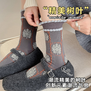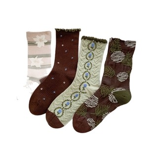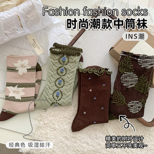 CHEEMY FREE秋冬新款复古花花系列中筒袜咖绿系森系棉袜ins风潮袜