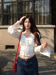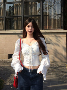 法式绑带一字肩蕾丝长袖衬衫女2025春秋季小众别致露锁骨绝美上衣