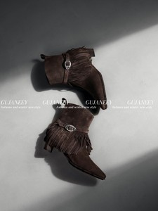 欧洲站女鞋25冬时尚流苏软牛猄皮尖头舒适款侧拉链粗低跟踝靴短靴