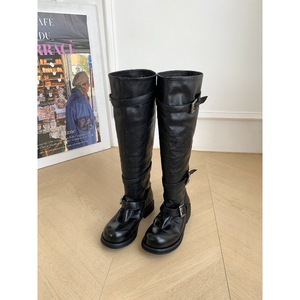 牛皮版小众设计大筒围不过膝长靴女褶皱堆堆靴圆头高筒靴子骑士靴
