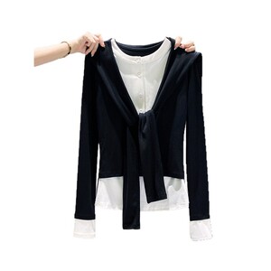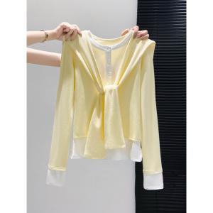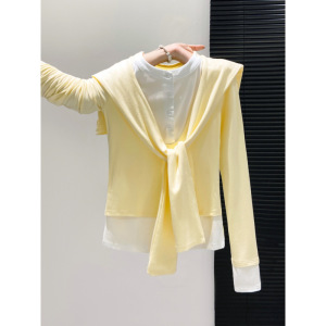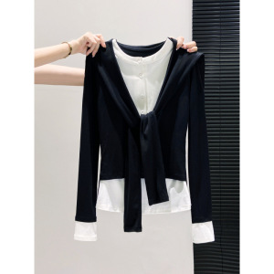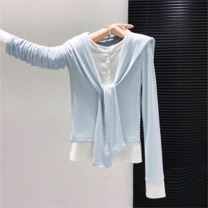 韩系小清新假两件披肩系带长袖T恤女2025早秋新款修身小衫A6974