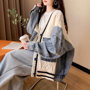 秋冬季新款时尚牛仔拼接针织开衫欧货休闲慵懒风宽松毛衣女装外套