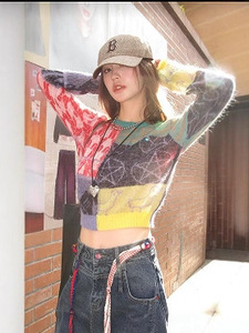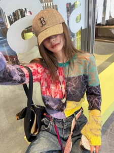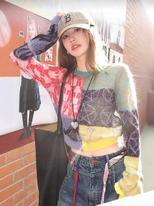 设计感彩绘撞色拼接长袖针织衫女款2025早秋宽松显瘦短款毛衣上衣