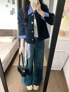 2025秋冬新款小香风时尚藏青色粗花呢正肩拼接外套女显瘦短款开衫