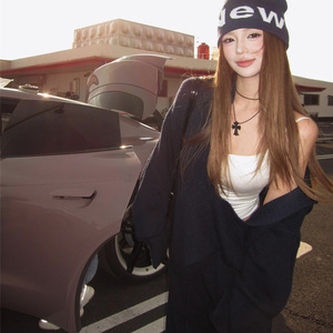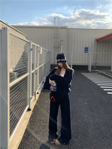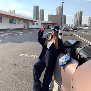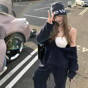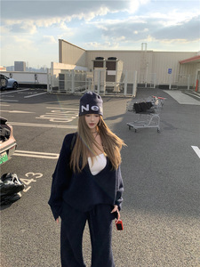 2025实拍藏青色慵懒针织套装女秋冬新款宽松V领毛衣裤子两件套