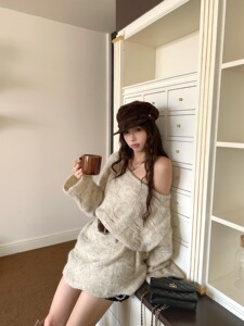 2025新款慵懒风宽松斜肩长袖毛衣女装秋季复古百搭露肩针织衫上衣