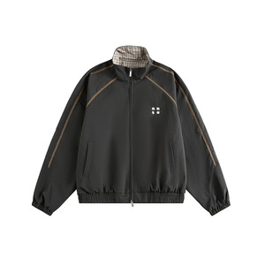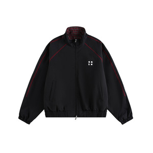 美式格子拼接红色外套男女春秋季新款简约宽松拉链夹克运动上衣