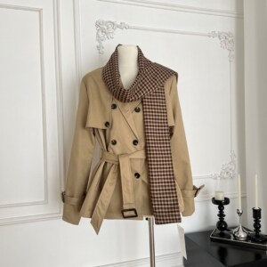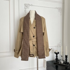 2025实拍秋季新款女式撞色翻领格纹双排扣小个子风衣外套送围巾