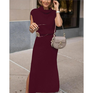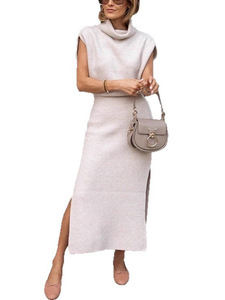 独立站跨境2025气质优雅休闲堆堆领纯色无袖针织衫+长裙子两件套