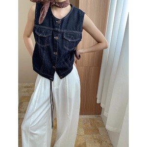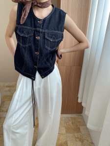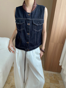司南 配丝巾 复古深蓝色撞色外缝线宽松显瘦牛仔马甲外套 SN8007