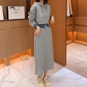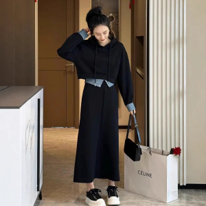 300斤大码感假两件连衣裙女春秋胖mm显瘦遮肉长袖卫衣裙套装2