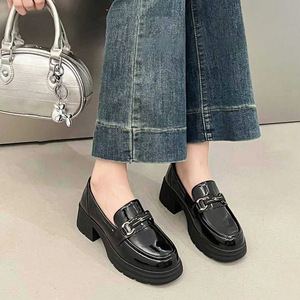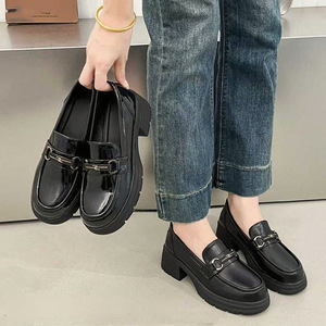 跨境真皮乐福鞋女2025秋季新款浅口套脚中跟工作皮鞋小个子女单鞋