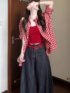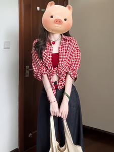 早秋季韩系红色格子防晒长袖衬衫衬衣女2025新款多巴胺绝美上衣