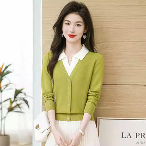 假两件POLO领针织衫毛衣女秋冬新款拼色高档保暖韩版短款打底上衣