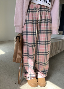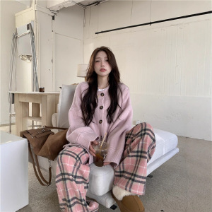 温柔气质甜酷风毛衣外套开衫+粉色格纹毛呢阔腿裤两件套女秋冬
