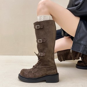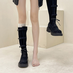 绒面设计感中筒时装靴女秋冬季复古百搭厚底松弛感复古粗跟马丁靴