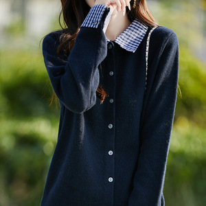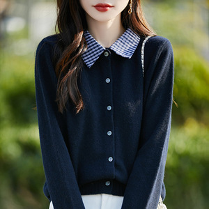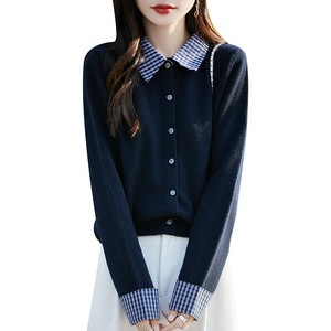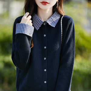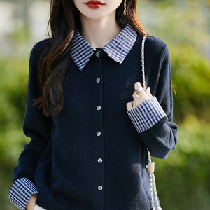 衬衫领拼接假两件针织开衫女2025春秋新款小个子洋气长袖上衣外套