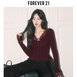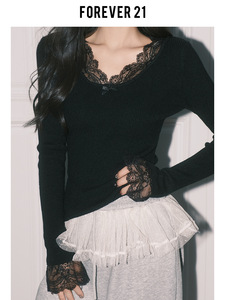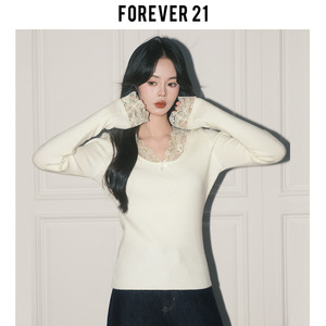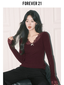 Forever21纯欲杏色蕾丝拼接V领上衣女秋冬法式打底长袖修身针织衫