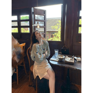 韩系chic薄款泡泡袖圆领衬衫女防走光开叉半身裙两件套
